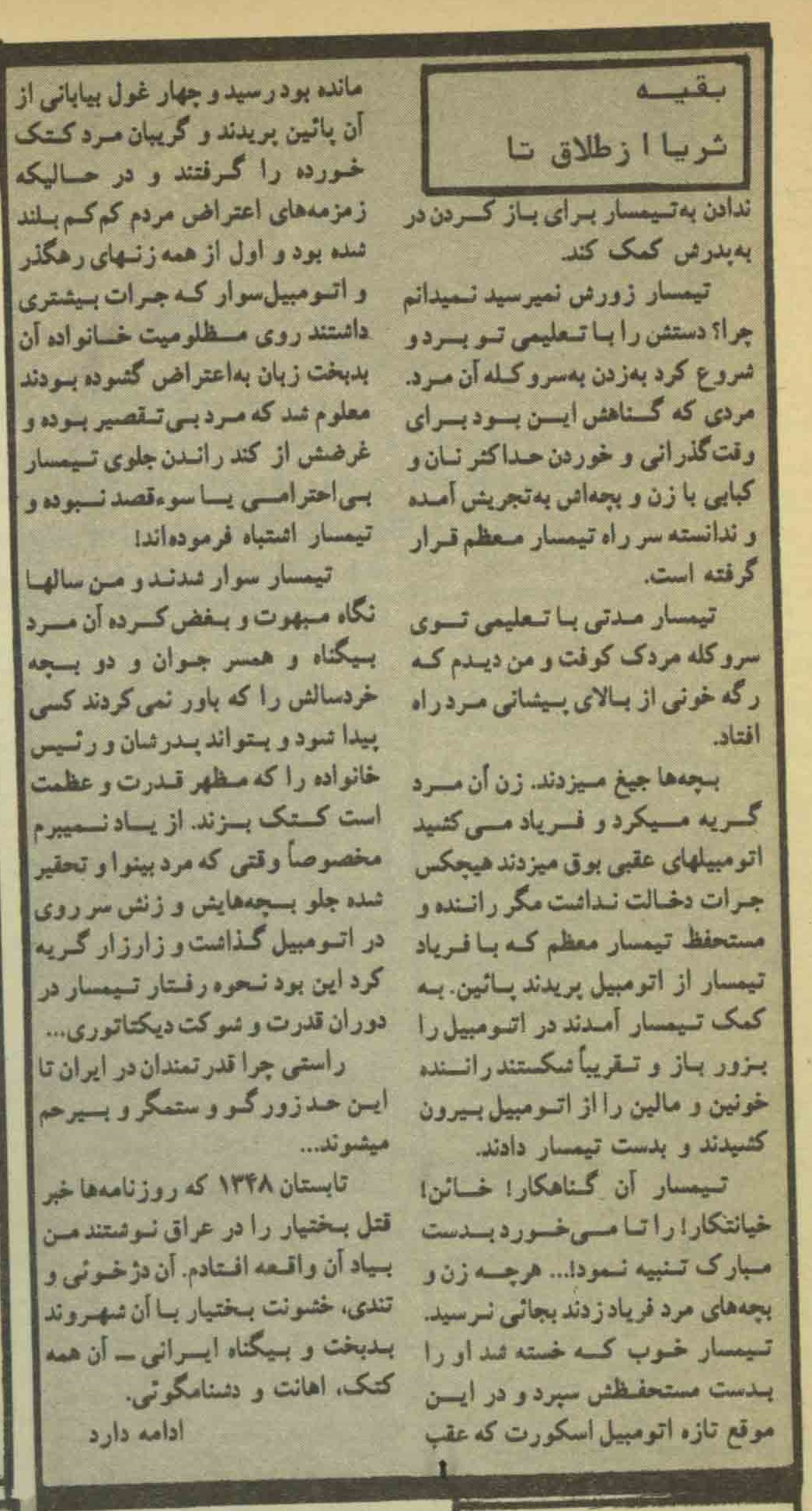 زن فریاد میکشید و داد میزد و میگفت: چیکارش داری؟ شوهرمو چیکار داری؟ تهلهجة رشتی داشت. بچهها عقب اتومبیل گریه میکردند. یکی از بچهها (پسرک) دستش را جلو آورد در گرفتن دستگیره و اجازهندادن به تیمسار برای بازکردن در. تیمسار دستش را با تعلیمی تو برد و شروع کرد به زدن به سروکله آن مرد. مردی که گناهش این بود برای وقتگذرانی و خوردن حداکثر نان و کبابی با زن و بچهاش به تجریش آمده و ندانسته سر راه تیمسار معظم قرار گرفته است. تیمسار مدتی توی سروکله مرد کوفت و من دیدم که رگه خونی از بالای پیشانی مرد راه افتاد. هیچکس جرئت دخالت نداشت مگر راننده و مستحفظ تیمسار که با فریاد تیمسار از اتومبیل پریدند پایین. در اتومبیل را بهزور باز و تقریباً شکستند. راننده خونی و مالین را از اتومبیل بیرون کشیدند و به دست تیمسار دادند.