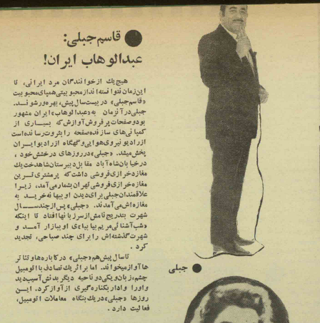 خاله انگار که یاد خاطرۀ خندهداری افتاده باشد، اول کلی خندید و بعد گفت: «احمد یادت هست جبلّی در دیدار با راجکاپور؟» دایی احمد هم وقتی یادش آمد بلند خندید و گفت: «هست تو همین تیکهروزنامهها دیدمش». من که حسابی کنجکاو شده بودم به دستان دایی نگاه میکردم که دایی گفت: «ایناهاش.» «یکروز میزبانان راجکاپور، او را به سینما دیانا آوردند تا چند قطعه از فیلمهای فارسی را تماشا کند. بالطبع سیل هنرمندان نیز به آنجا سرازیر شده بودند از جینالولوی وطنی و مهین معاونزاده گرفته تا شاپوری و ایرن و آقای قاسم جبلّی (اسم ایشان را بهاین جهت آوردم که این ماجرا مربوط به آقاست.)