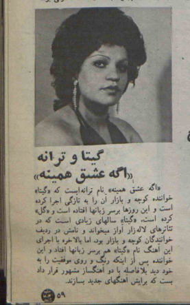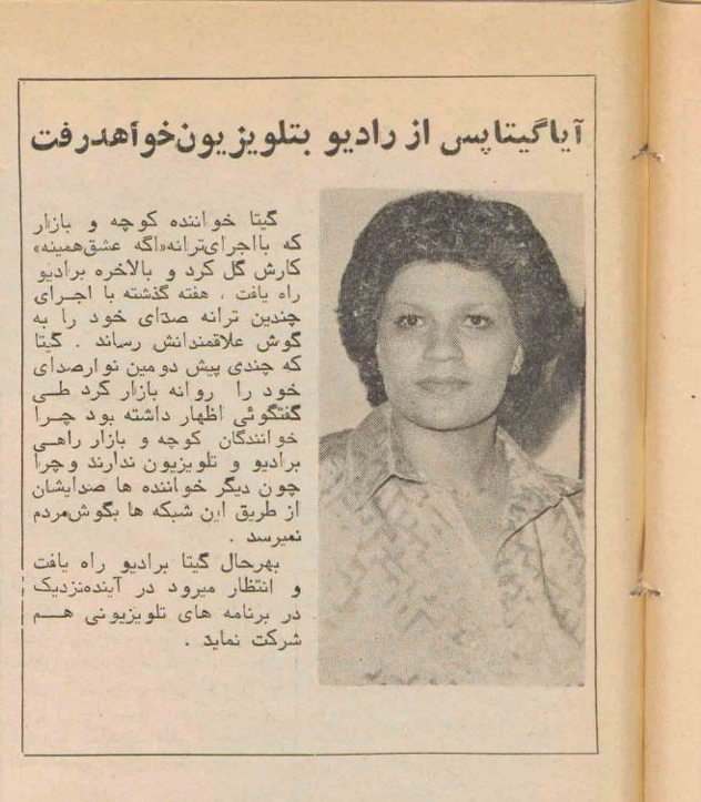 من خندیدم و گفتم: «پسکوچهبازارِ خیابان لالهزار هم یه جورایی برنامه عصر جدید اون موقعها بودهها.» خاله خندید و گفت: «آره؛ تازه گیتا بالاخره به رادیو هم راه پیدا کرد.[5]»
