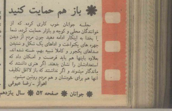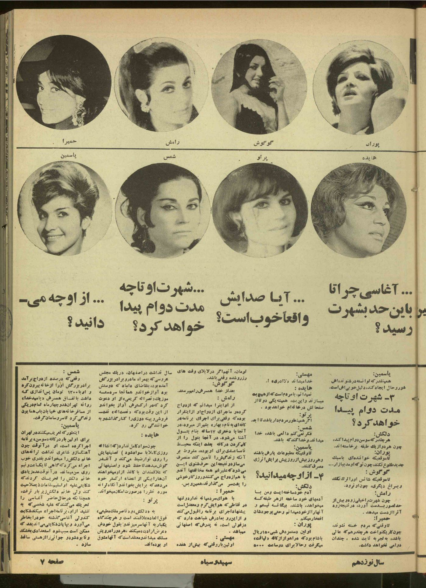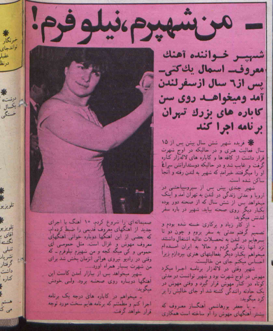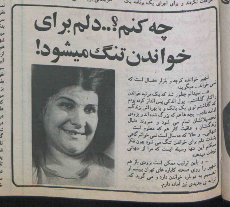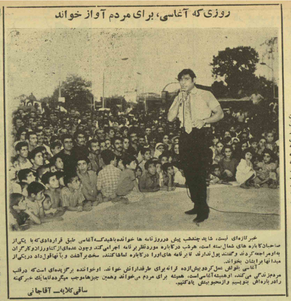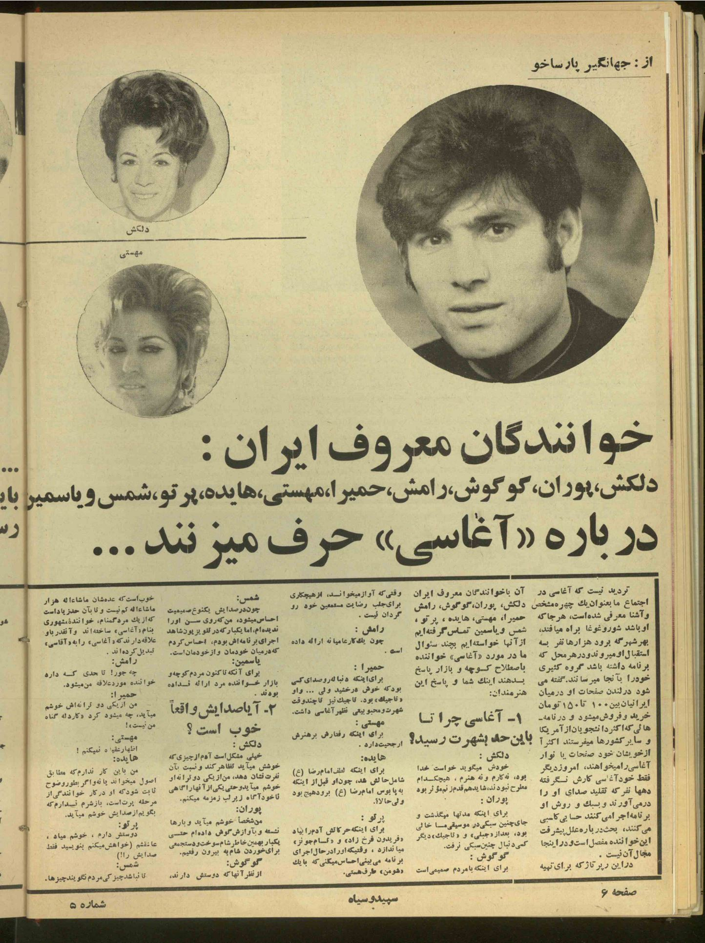 یکی از آنها را از خاله گرفتم و شروع کردم به خواندن. «خوانندگان معروف ایران دربارۀ آغاسی حرف میزنند.[13]»