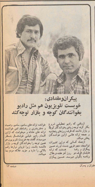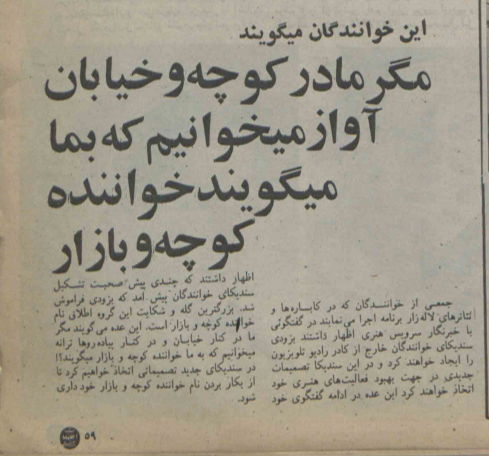البته همیشه ابراز علاقه نبود و گاهی مردم بهشون اعتراض هم داشتن. «مردم یهبار میپرسیدن که چرا ترانههای بهاصطلاح کوچهبازاری از رادیو پخش نمیکنید و باز میپرسیدن که چرا شورای موسیقی، شعر و آهنگ رو کنترل نمیکنه؟[11]»