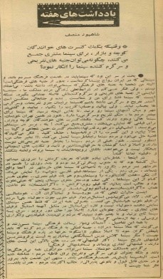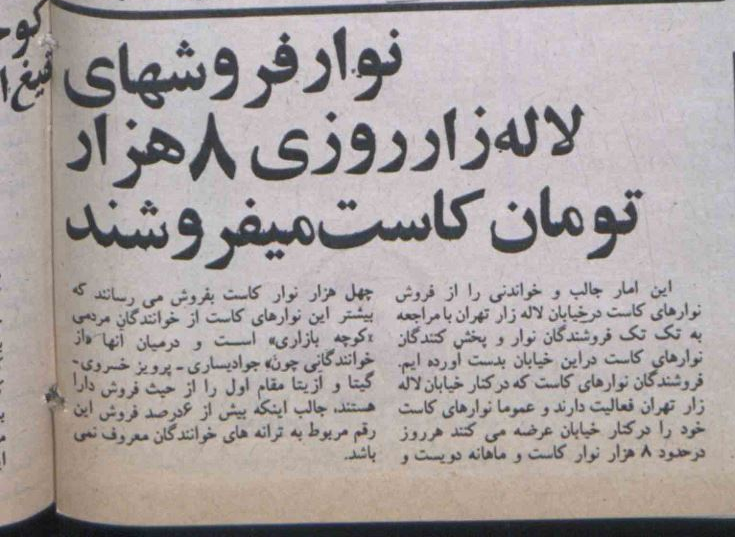 به خاله گفتم: «عجب! پس چقدر همین یه مدل موسیقی دبدبه و کبکبه داشته. حالا یعنی ایننوار کاست، آلبوم جبلیه»؟ خاله گفت: «نه! این آهنگا تو کوچهبازار اجرا میشده و کمتر در قالب آلبوم (جنگ) منتشر میشدن. اون موقع همین کاستهایی که نه آلبوم بودن و نه کیفیت داشتن بیشتر از آلبومها فروخته میشد. یادمه یکبار تو روزنامه خوندم: نوارِ فروشهای لالهزار روزی ۸ هزار تومان کاست میفروختند.[9]»