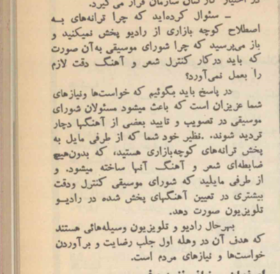 با شنیدن این عدد، بلند از سعید پرسیدم: «یعنی به نرخ امروز چقدر؟» خندید و گفت: «خیلی؛ احتمالاً چیزی حدود 20 -30 میلیون. البته خب همشون باهم». زیر لب گفتم: «عجب! واقعاً مردم میخریدن؟» خاله گفت: «بله، میخریدن؛ البته لالهزار هم اعیونی بود». بعد ادامه داد: «یه رادیو تعطیلی هم داشتیم که پنجشنبه و جمعه از همین دست موسیقیها پخش میکرد. خوانندههای کوچه و بازار از این اقدام رادیو تعطیلی هم خیلی راضی بودن؛ اما اونا خواستار پخش ترانهها از تلویزیون هم بودن؛ استدلالشون هم این بود که فروش نوارها رقم بالائی داره و این نشونۀ علاقه مردم به ماست.[10]»