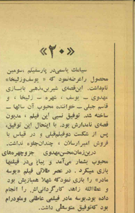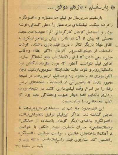 بعد آمد نزدیک کشو تا تکههای روزنامه را پیدا کند. با کمی زیروروکردن گفت: «آهان بیا.» «کاردان وقتی تو همین طرح شکست خورد تو مصاحبهاش با مجلۀ ستارۀ سینما گفت: «ما با تماشاگر مست سروکار داشتیم و به اجبار، هر شب چندین مأمور نیروی انتظامی از ما حمایت میکرد و بالاخره نتوانستیم ادامه دهیم. تماشاگر زیادی از بالای شهر داشتیم؛ اما این تماشاگر وقتی میآمد و بغل دست یک نفر مست مینشست، دیگر نمیآمد. بالاخره یک نفرمان چاقو خورد و سه نفرمان هم کتک خورد و دیدیم ادامۀ کار (برگزاری تئاتر در لاله زار) ممکن نیست[25].»