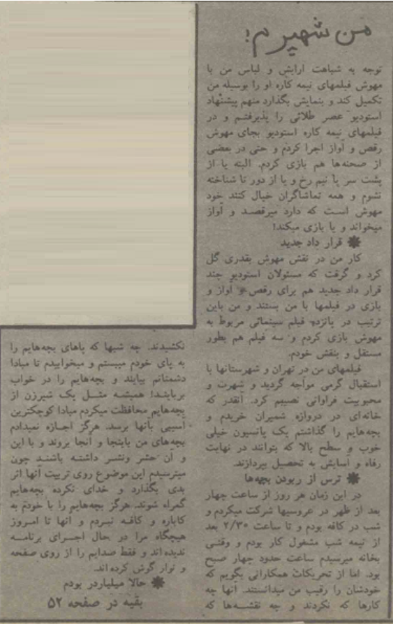 بعد گفتم: «یه چیز جالب دیگه هم پیدا کردم.» نوشته: «همیشه مثل یک شیرزن از بچههایم محافظت میکردم؛ مبادا کوچکترین آسیبی به آنها برسد. هرگز اجازه نمیدادم بچههای من به اینجاوآنجا بروند و با اینوآن حشرونشر داشته باشند؛ چون میترسیدم این موضوع روی تربیت آنها اثر بدی بگذارد و خداینکرده بچههایم گمراه شوند. هرگز بچههایم را با خودم به کاباره و کافه نبردم و آنها تا امروز هیچگاه مرا در حال اجرای برنامه ندیدهاند و فقط صدایم را از روی صفحه و نوار گوش کردهاند.[20]»