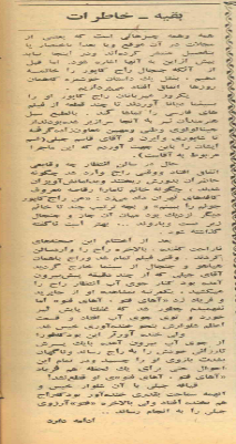حال در سالن انتظار چه وقایعی اتفاق افتاد و وقتی راج وارد شد چگونه حاضران بهدورش ریختند و بهدامانش آویزان شدند، چگونه خانم تامارا رقّاصۀ معروف کافههای تهران داد میزد: «من، راجکاپور جونم را ببینم؛ و به چه ترتیب چند تا خانم دیگر نزدیک بود میان آن جار و جنجال زیر دست و پا بروند، بهتر است ناگفته گذاشته شود. بعد از اختتام این صحنههای ناراحتکننده، بالاخره راج را وارد سالن کردند. وقتی فیلم تمام شد و راج با همان هیاهو و جنجال از سینما خارج گردید. آقای جبلّی که از چند دقیقه پیش بیرون آمده بود، کنار جوی آب انتظار راج را میکشید، یکمرتبه به مشاهده او از جا پرید و فریاد زد: «آهای فتو، آهای فتو» اما نفهمیدم چطور شد که غفلتاً پایش لیز خورد و توی جوی آب افتاد و قسمت اعظم شلوارش بهنحو خندهآوری خیس شد؛ ولی خندهآورتر این بود که فوراً از جوی آب بیرون آمده با یک پرش تارزانی خودش را به راج رساند و ناگهان بهشدت بازوی او را چسبید و در تمام این احوال حتی برای یک لحظه هم فریاد آهای فتو، آهای فتوی او قطع نشد. قیافه جبلی با آن شلوار خیس و آن همه سماجت بهقدری خندهآور بود که راج هم بهخنده افتاد؛ ولی بالاخره «فتو» آرزوی جبلی را به انجام رساند[27].»
